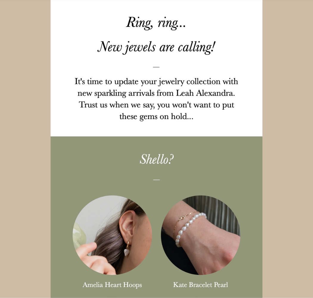 - Goal: Promote new arrivals from Leah Alexandra Jewelry